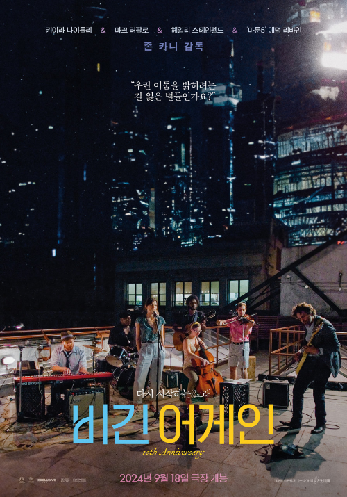 비긴 어게인은 2013년 개봉한 음악 드라마로, 존 카니가 각본과 연출을 맡았다. 이야기는 뉴욕에서 시작된다. 댄 멀리건(마크 러팔로)은 한때 성공한 음반 프로듀서다. 그는 독립 레이블을 설립했지만, 시대에 뒤처지고 술에 의존하며 몰락한다. 어느 날, 회사 파트너 사울(야신 베이)에게 해고당하고, 아내 미리엄(캐서린 키너)과도 이혼한 그는 딸 바이올렛(헤일리 스타인펠드)과도 멀어진다. 술에 취해 동네 바에 들어간 댄은 그곳에서 기타를 치며 노래하는 그레타(키이라 나이틀리)를 발견한다. 그녀의 목소리에 매료된 댄은 즉석에서 편곡을 상상하며 그녀에게 다가간다.