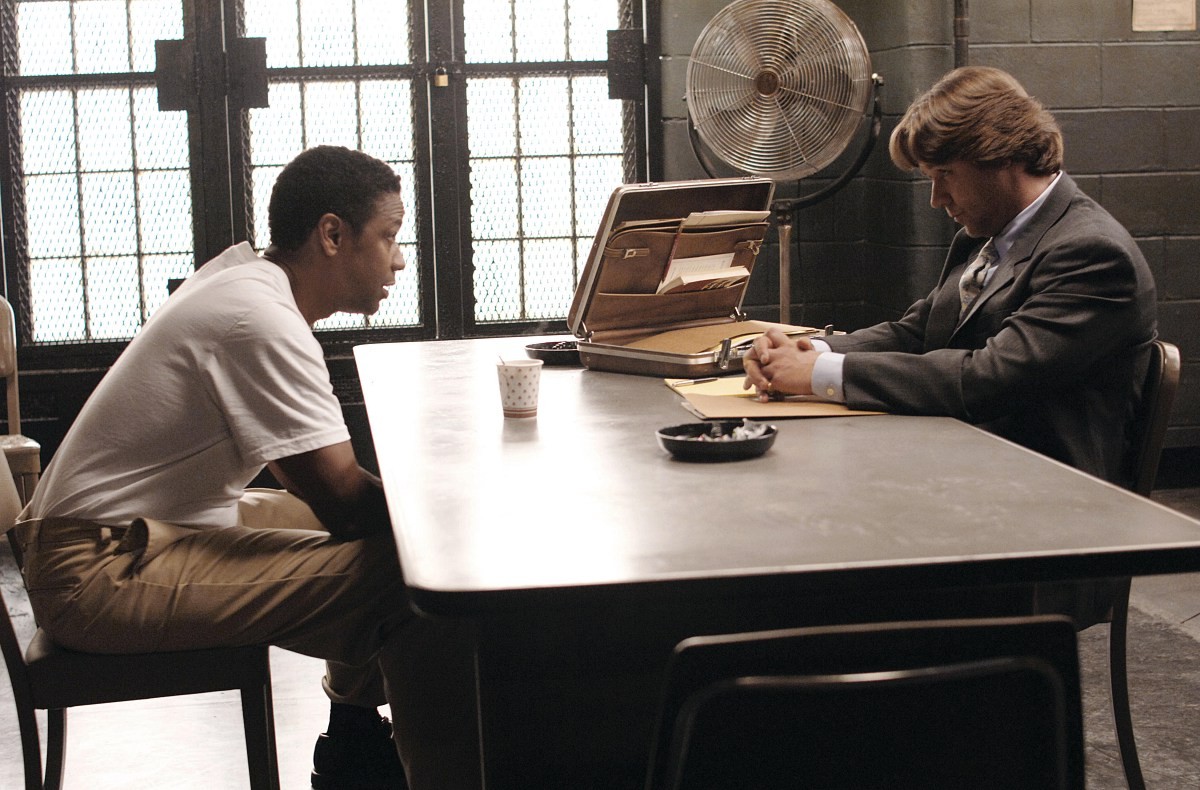 덴젤 워싱턴은 프랭크 루카스 역으로 냉혹한 카리스마와 인간적 면모를 완벽히 융합한다. 그는 억제된 분노와 날카로운 눈빛으로 마약왕의 위엄을 뽐내며, 가족을 챙기는 온화한 모습으로 캐릭터의 양면성을 드러낸다. 특히 교회 체포 장면에서의 침묵과 마지막 뉴욕을 바라보는 장면의 쓸쓸함은 그의 연기력을 집약한다. 러셀 크로우는 리치 로버츠로 정직함과 고독을 섬세하게 그려낸다. 그는 거친 외모 뒤에 숨은 원칙주의자의 고집과, 정의를 향한 집념을 몸짓과 목소리로 표현하며, 프랭크와의 대결에서 묵직한 균형을 이룬다.